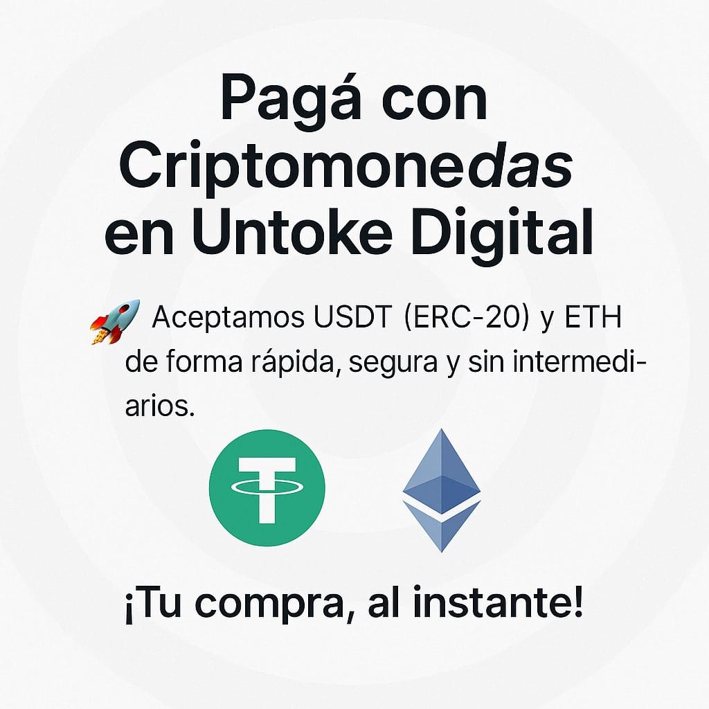 Aceptamos USDT (ERC-20) y ETH de forma rápida, segura y sin intermediarios. ¡Tu compra, al instante!”