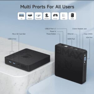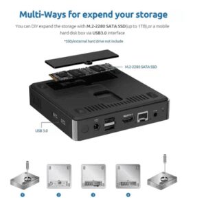 – Gran almacenamiento expandible: esta pequeña computadora de 8 GB de RAM + 128 GB eMMC es compatible con expandir el almacenamiento adicional con SSD SATA M.2_2280 (hasta 1 TB) y una caja de disco duro móvil a través de la interfaz USB3.0.