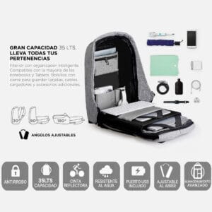 Movete con estilo y seguridad con esta 🎒 Mochila Urbana 35L con sistema Antirrobo y Puerto USB, ideal para el día a día en la ciudad.