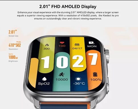 El Kieslect KS Pro Silver combina diseño elegante, pantalla ultra nítida y funciones avanzadas para acompañarte todo el día. Equipado con una espectacular pantalla AMOLED de 2.01”, este smartwatch te permite mantenerte conectado, monitorear tu salud y entrenar con estilo.